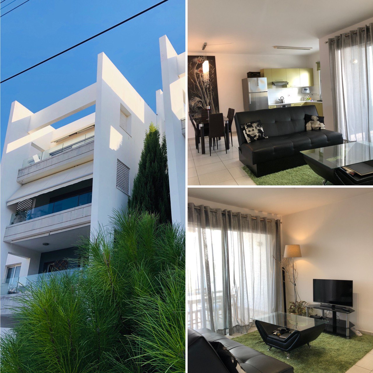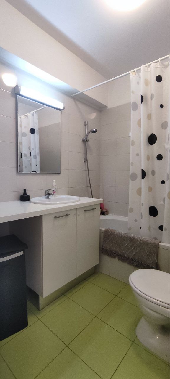 Opposite a green area with playground